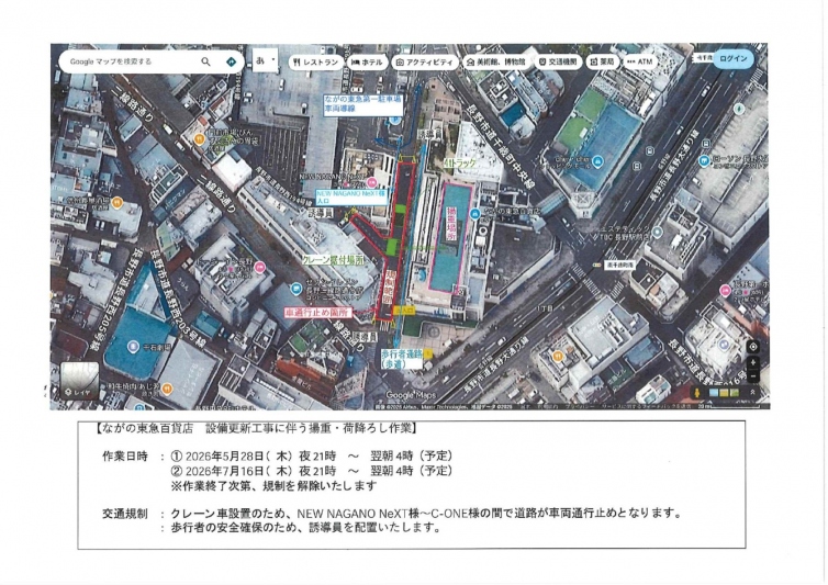 We would like to inform you that renovation work will be carried out at a nearby facility (Nagano Tokyu Department Store) on the dates listed below.